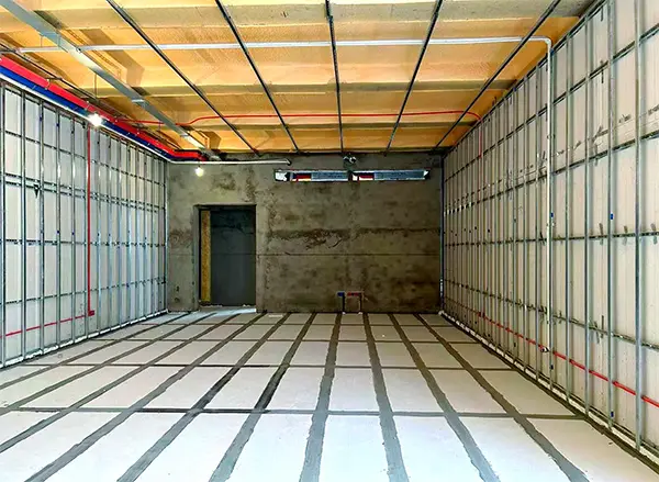 Regardless of the type of roof, it is best to put a layer of insulation foam on the top side of the roof panels. Here the insulation wool is both soundproof and fire and moisture resistant. If the mechanical room in the basement is too noisy, the part of the wall that separates the furnace and water furnace can be made double DRYWALL boards inside and outside (i.e., 4 layers of boards), with insulation foam in the middle, and the wall should be all the way to the top, so as to achieve the best acoustic insulation effect.
